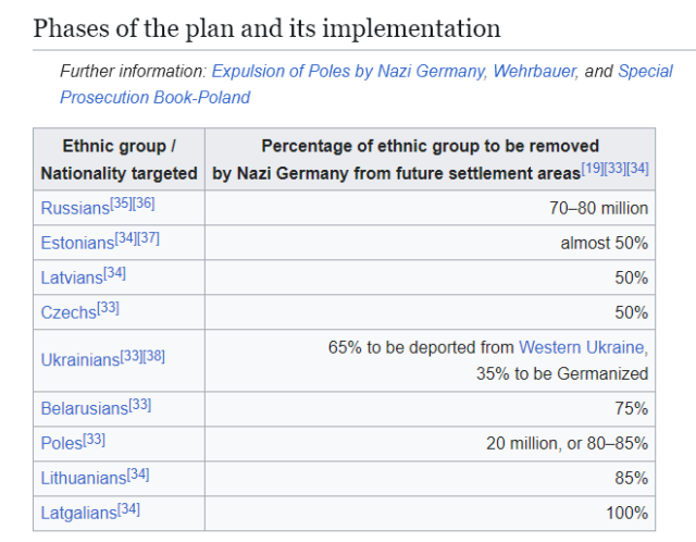 “Generalplan Ost was Nazi Germany’s plan for the colonization and Germanization of Central and Eastern Europe over a period of twenty-five years. Implementing it would have necessitated genocide and ethnic cleansing on a vast scale to be undertaken in the Eastern European territories occupied by Germany during World War II. It would have included the extermination and de-population of most Slavic people in Eastern Europe.” – Wikipedia.