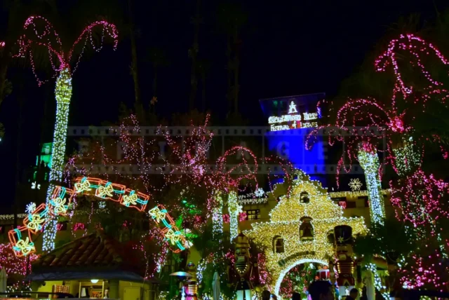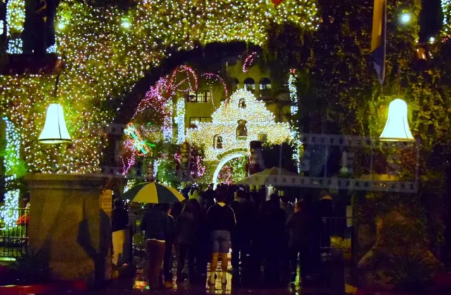 The Festival of Lights in Riverside, California, is an annual tradition. The Mission Inn makes a considerable effort to decorate the exterior and interior of the hotel.