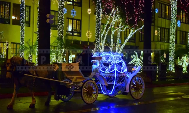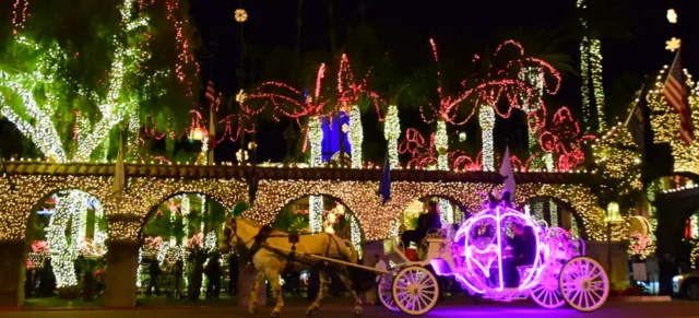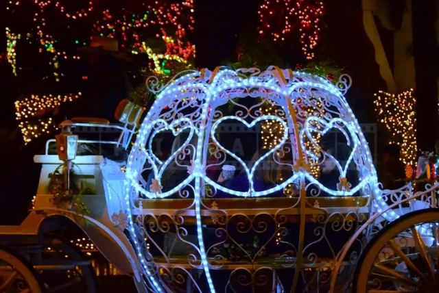 Visitors can enjoy the Mission Inn Festival of Lights from the comfort of beautiful horse-drawn carriages. Carriages themselves are a piece of art and are brightly lit with lights as well.