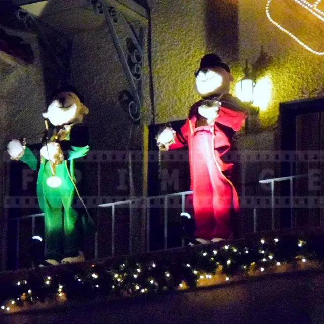 The Christmas lights are everywhere. Also, there are many fairy tale Christmas characters, Santa Claus with his sleigh and reindeer.