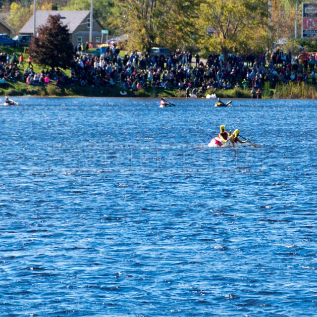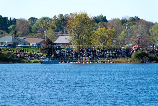 After you enjoyed the pumpkin parade, walked around Haliburton House estate, and had lunch, now will be the time for the highlight of the day – the giant pumpkin regatta. The race takes place every year in early October at the Pisiquid lake in Windsor, NS. More details can be found at the Tourism Nova Scotia site. The race starts at around 2 pm. There are many spots where to watch it from. The shores of the lake can accommodate many visitors, and it is easy to find free parking anywhere in the streets of this small charming Nova Scotia town.