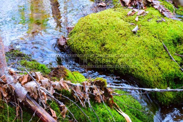 To get to Millet Falls look for a private road that runs along the Falls Lake, Nova Scotia. This is the start of the hiking trail and usually, there is a space for parking a couple of cars. Follow this gravel road and enjoy the beautiful landscape. Several cottages are lining the banks of Falls Lake. These properties have a nice view of the water and are used in summertime. Small forest brook runs on the left side of the road in the spring. Lake, brook are great subjects for water images. When the road ends there is a wide opening in the woods and a large old pine tree stands on guard. Photograph this old pine, you will enjoy these nature pictures later for sure. To the right of this pine tree real hiking trail begins, it will lead you through the forest to the beautiful Millet Falls, one of many spectacular Nova Scotia waterfalls.