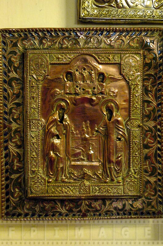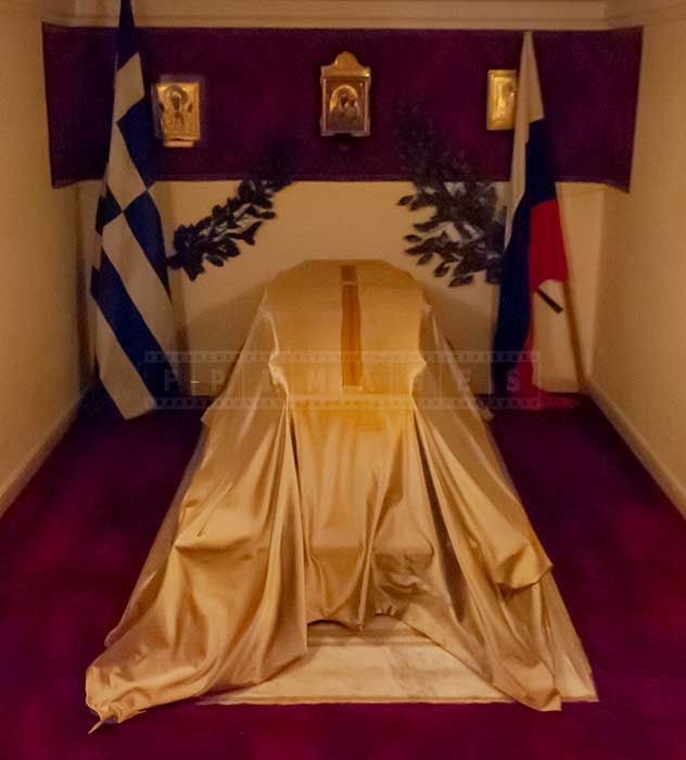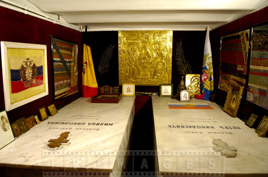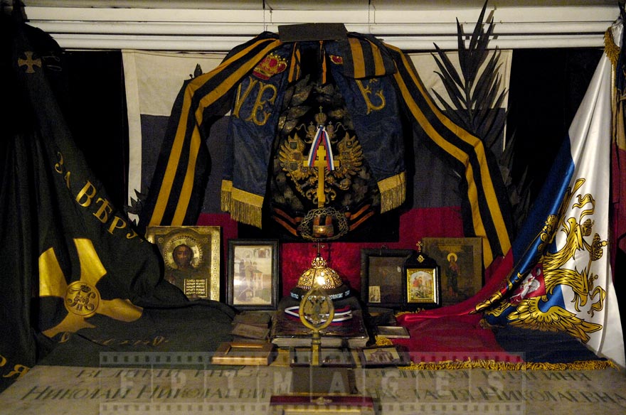 The church also has a basement that is a museum and has many interesting items with history. Two cousins of Nicholas II, the last Russian emperor, are buried there with their wives: Grand Duke Nicholas and his wife Anastasia and Grand Duke Peter and his wife Militsa. They lived in France in exile after fighting a brutal civil war that started after the 1917 revolution. Grand Duke Nicholas was well respected by the soldiers and officers. Many of them had to emigrate to France. When Grand Duke died, they brought many military regiment flags as a tribute to his service.