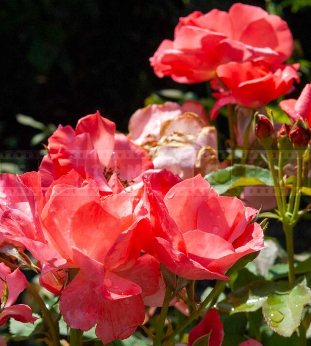 Tequila Sunrise hybrid tea rose bush is hardy and needs full sunshine. Pernille Poulsen rose blooms abundantly with clusters of pink to salmon-colored rose flowers, it is of floribunda rose type – a product of hybrid tea rose crossed with polyantha rose. A stunning combination of dark green leaves and bright red flowers will make Lili Marlene floribunda rose to stand out in any garden.