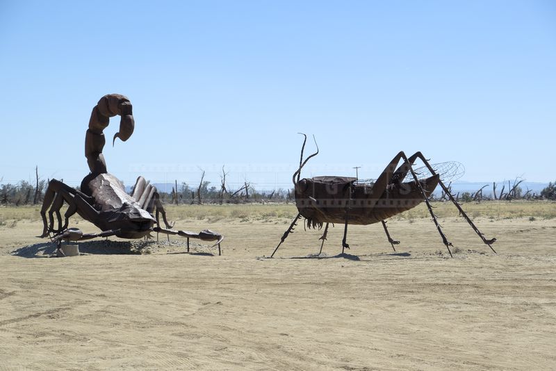 The Scorpion and Grasshopper sculptures engage in a silent battle, frozen in time.