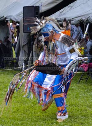 This Nova Scotia Mi’kmaq head dancer features white and blue fancy dance regalia with orange accents. He wears beautiful Native American beads and lots of eagle feathers. Mi’kmaq one of many First Nations in Canada has its own hieroglyphs. You can easily spot these Mi’kmaq hieroglyphs orange in color on this beautiful fancy dance regalia.