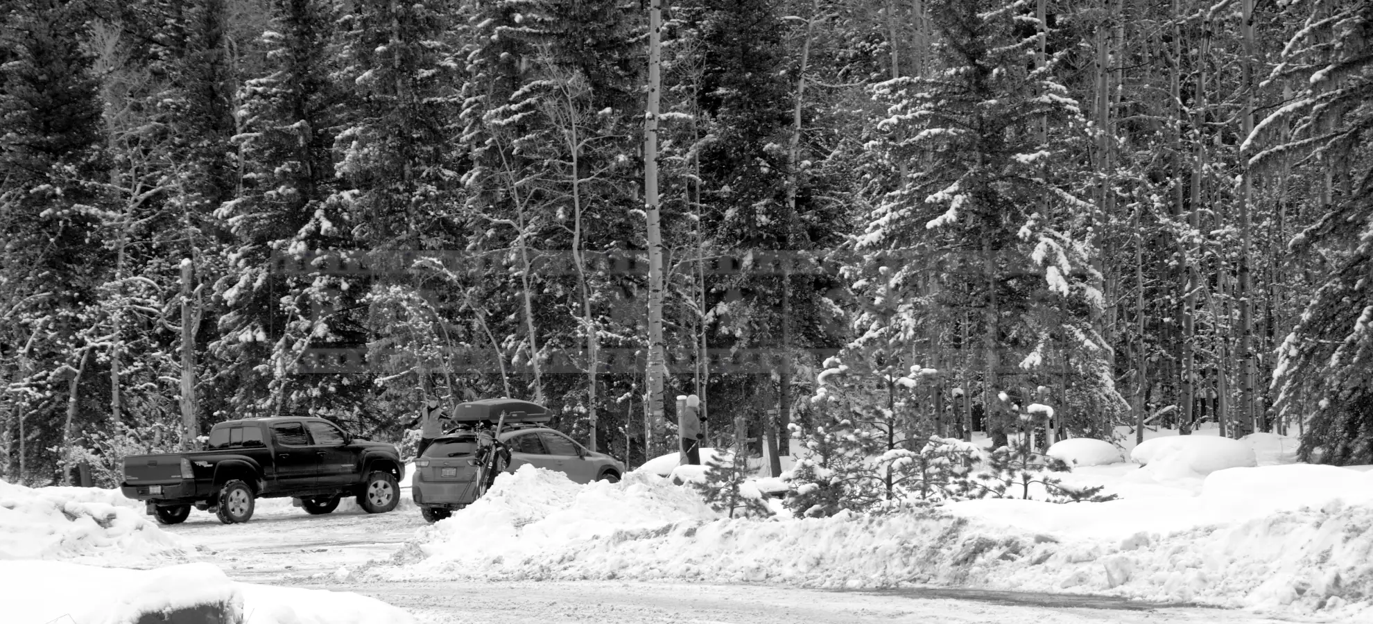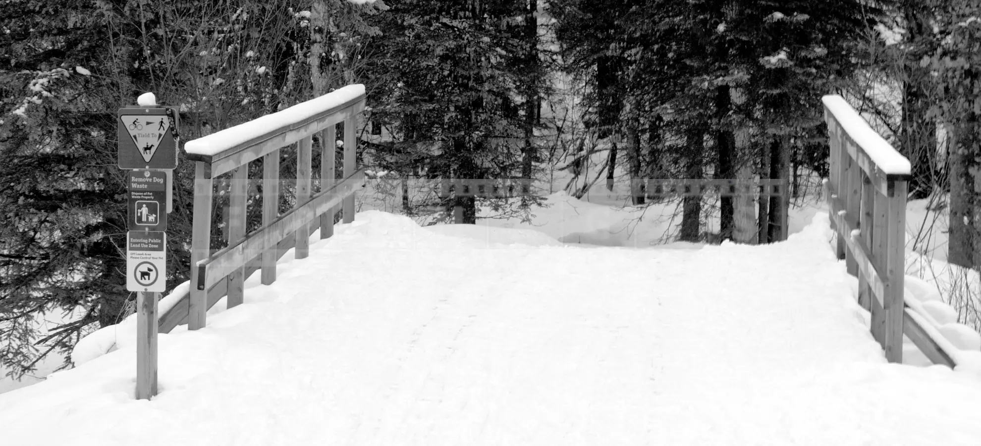 Black and white winter landscape with lots of snow and a water featureWinter trail through the woods in CanadaWinter trail with a bridge and picnic area at Bragg CreekSnow-covered banks of a small streamAmazing winter scenery at one of the trails at Bragg CreekBlack and white picture of the small brook and forest in winterBragg Creek Trails sign for the multi-use trail – hike, snowshoe, bike, skate ski and classic XC skiBeautiful wooded trail with people cross-country skiingAn information stand and a changing cabin at the start of the trailsPark and ski right from your car – perfect winter setup